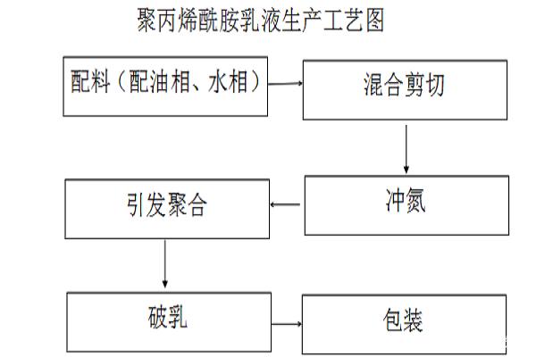 反相乳液聚合法制備的聚丙烯酰胺乳液,與傳統(tǒng)工藝相比,有效含量高,分子量高,穩(wěn)定性好,長時間放置只有少 量分層。以下為聚丙烯酰胺乳液生產(chǎn)工藝流程圖: